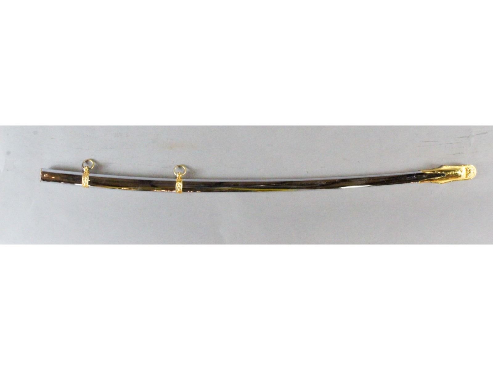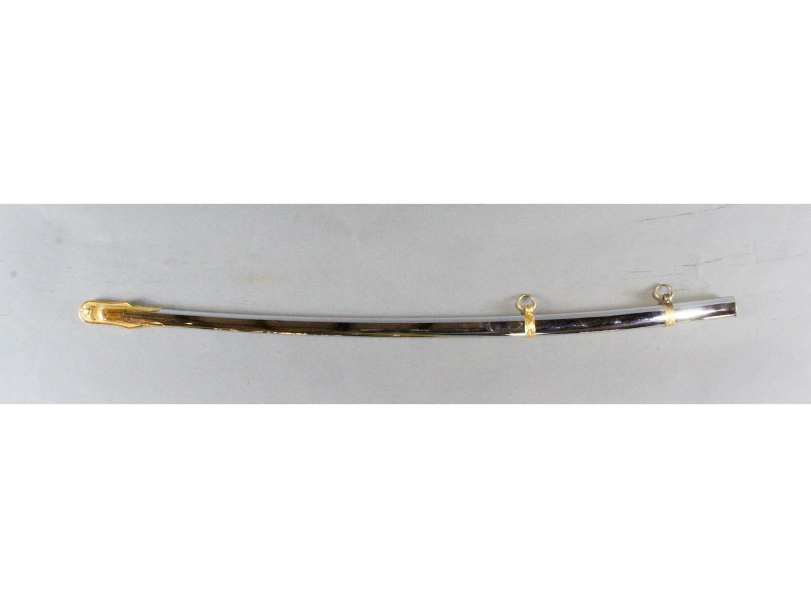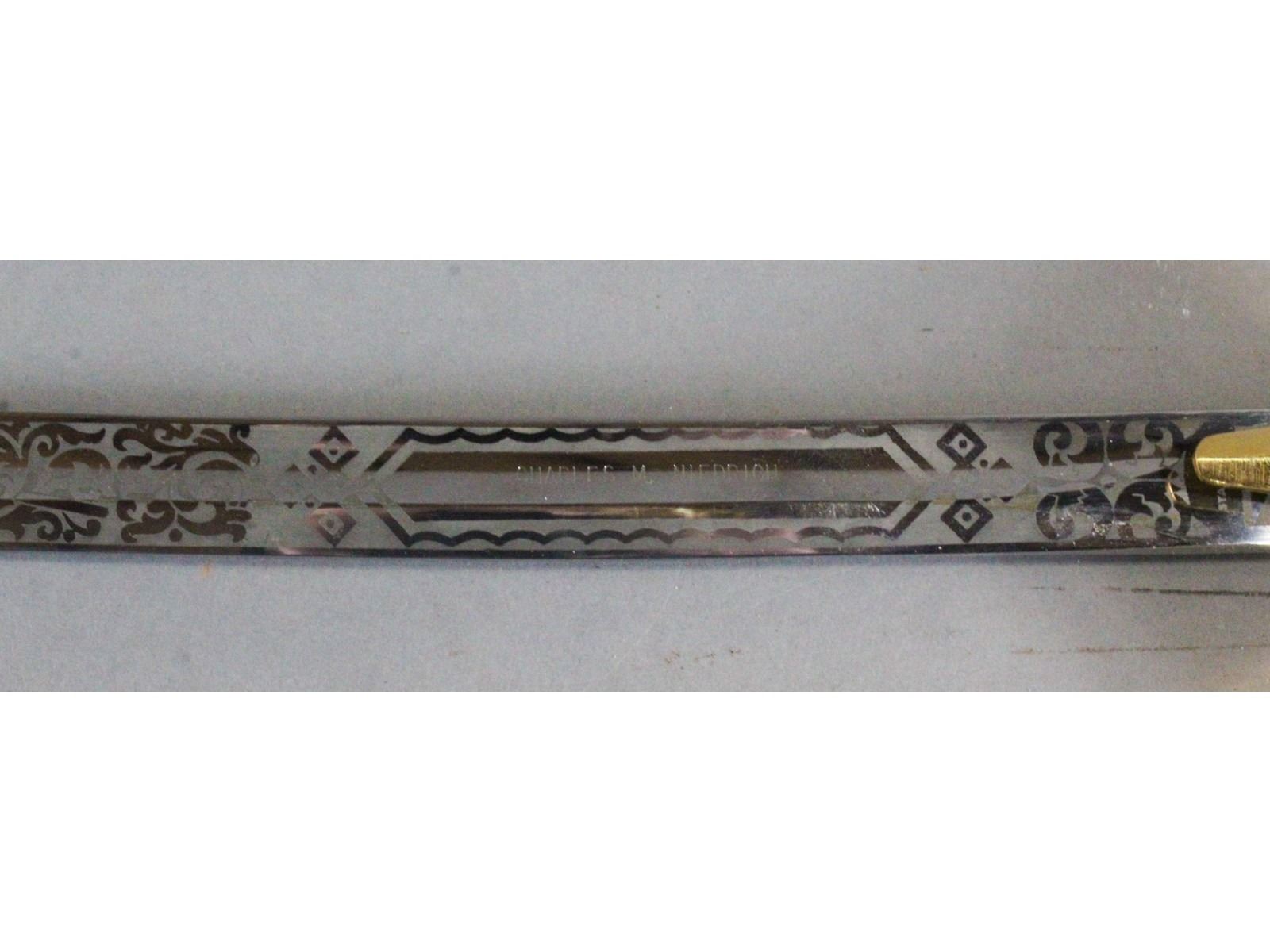 Modern version of 1875 model. Beautiful engraved blade with United States Marines etched on both sides. ID to Charles M Niedrich stamped on blade. Complete with very nice brass hilt with it's original leather sword knot. Chrome plated scabbard with brass mounts. Maker marked.