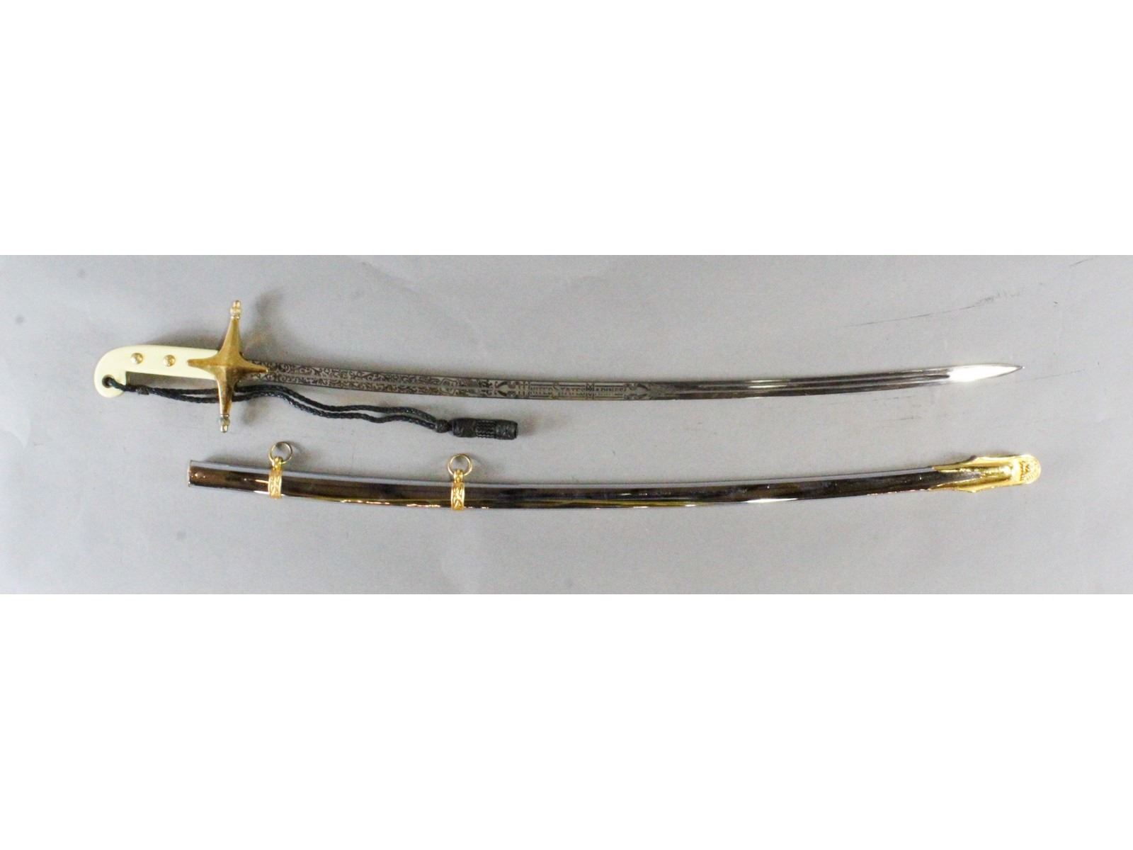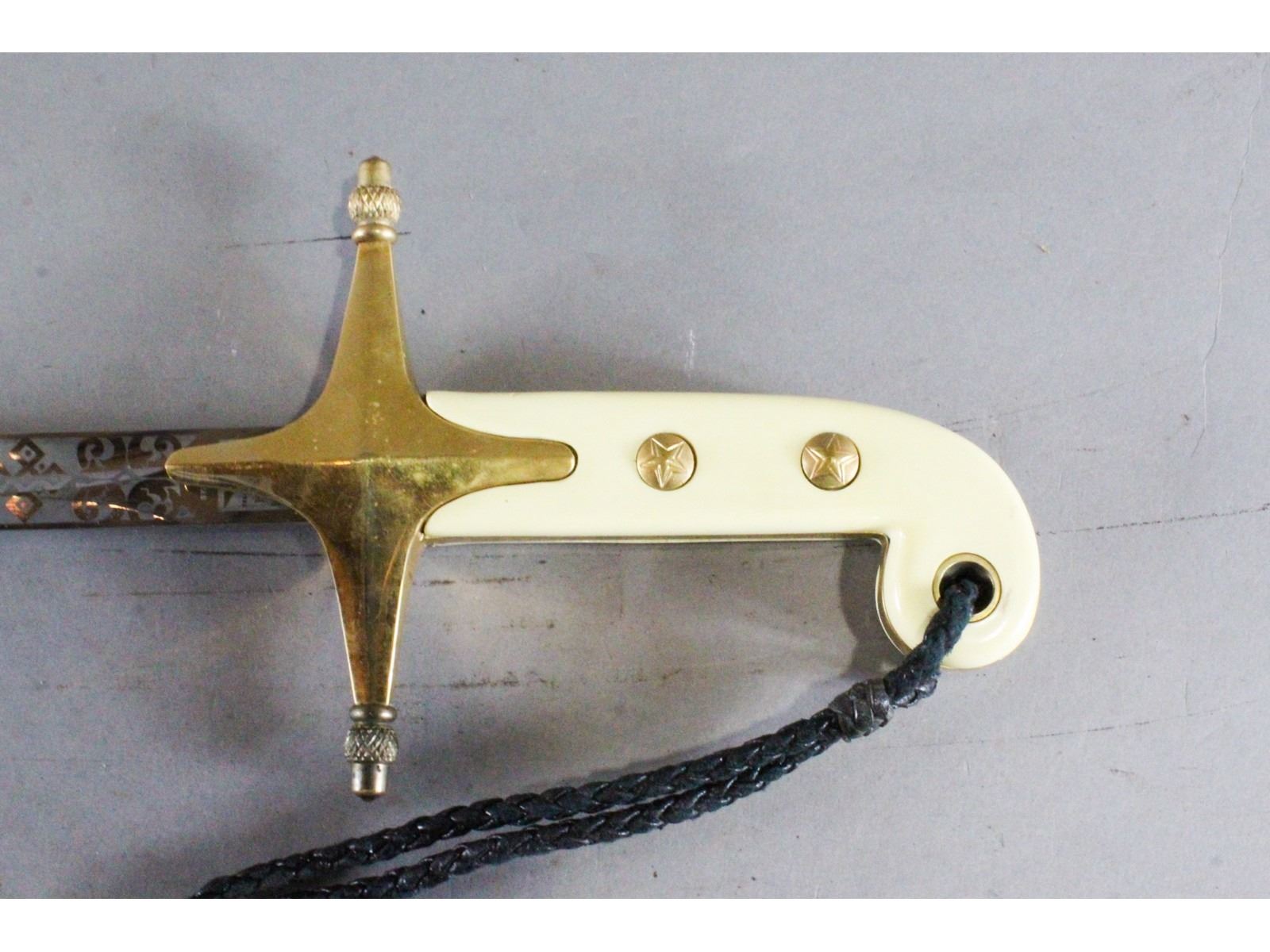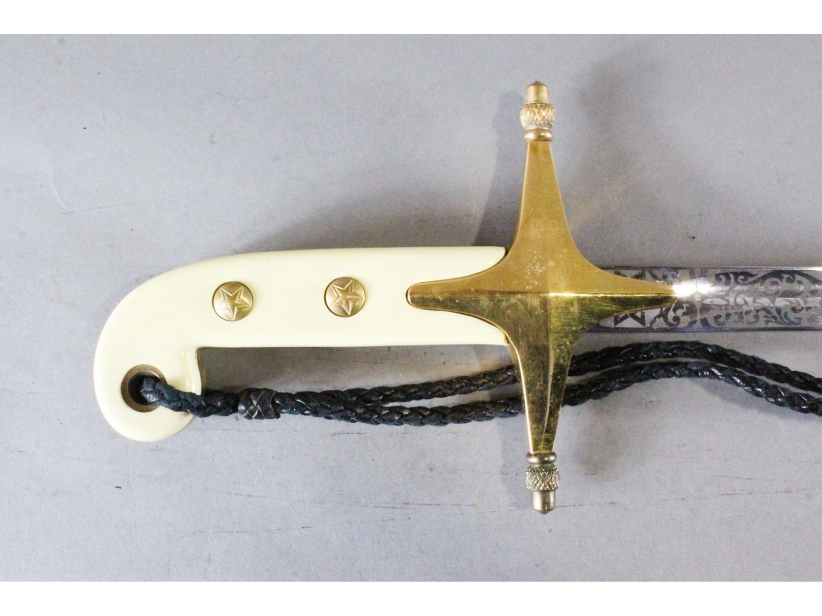 Modern version of 1875 model. Beautiful engraved blade with United States Marines etched on both sides. ID to Charles M Niedrich stamped on blade. Complete with very nice brass hilt with it's original leather sword knot. Chrome plated scabbard with brass mounts. Maker marked.