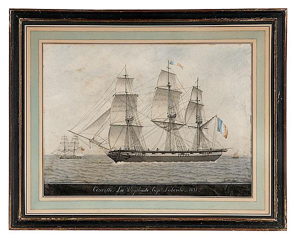 ca 1831. Watercolor on wove paper, titled, Corvette, La Vigilante, Capt. Laborde, 1831, signed indistinctly lower right. While there was a slave ship named "La Vigilante", this vessel of the same name was part of a group of lightly armed vessels that patrolled the coast. French mat in a later frame; 15" high x 20.25" wide (sight).