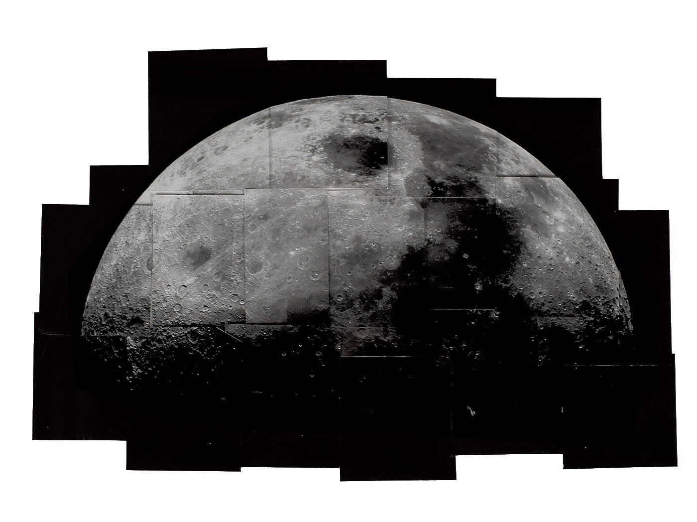 Large photo mosaic produced by the NASA Jet Propulsion Laboratory in November 1973, comprising 21 glossy 3.5 x 4.5 silver gelatin prints arranged in an overlapping manner to an overall size of 19 x 12.5, depicting a fascinating view of the moon as seen from the Mariner 10 probe. Reverse of each print has "This paper manufactured by Kodak" watermarks. In fine condition. Launched on November 3, 1973, on a voyage to fly by Venus and Mercury, the Mariner 10 tested its camera system during its first week of flight by taking five photographic mosaics of Earth and six of the moon. A wonderful oversized mosaic portraying the lunar surface.