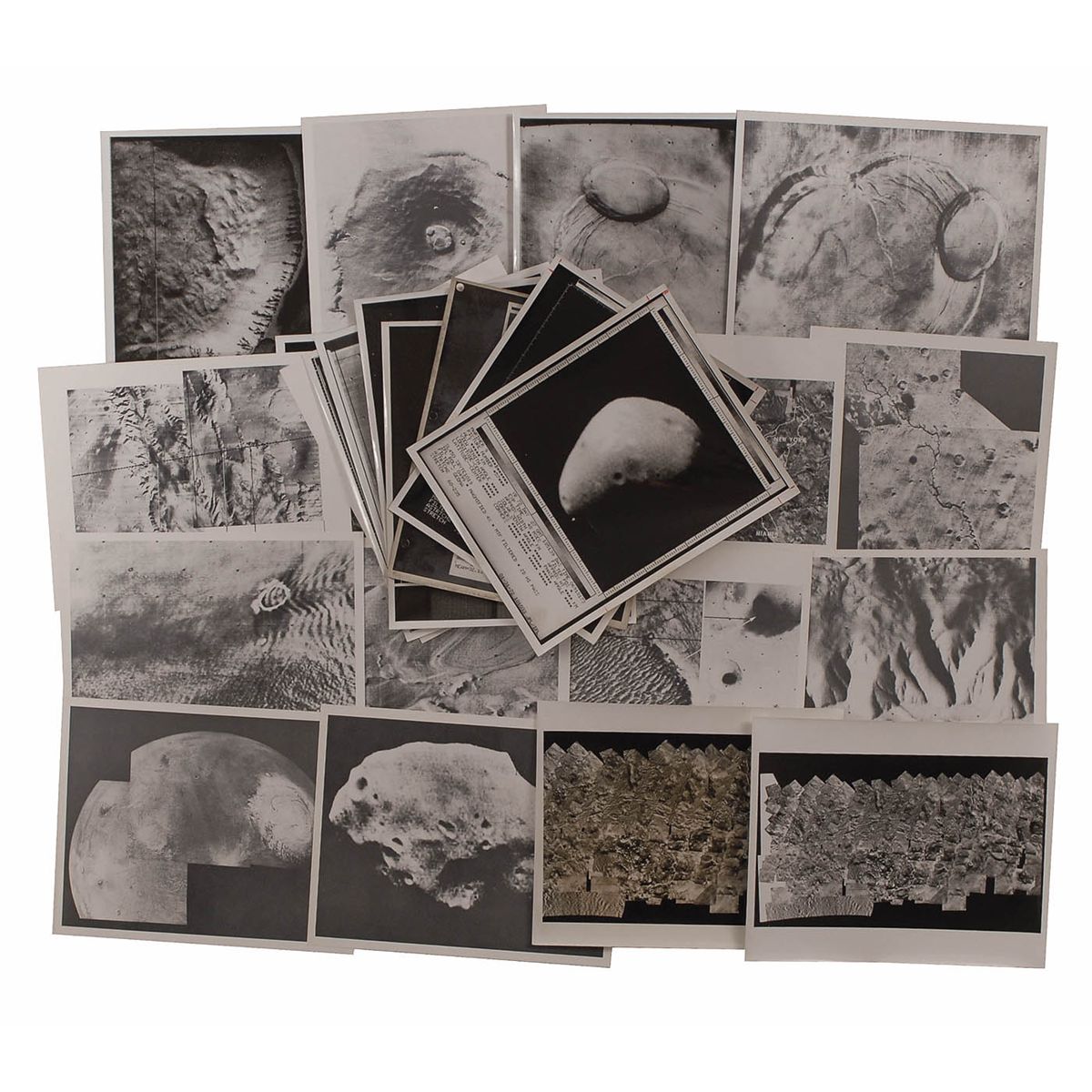 Twenty four photos, 8 x 10 and 10 x 8, of images of Mars taken by Mariner 9. Includes the set of 12 semi-glossy cardstock press photos with captions to the reverse, and 12 original glossy photos, some with images corresponding to the press photos. In overall fine condition, with some light bends and creases.