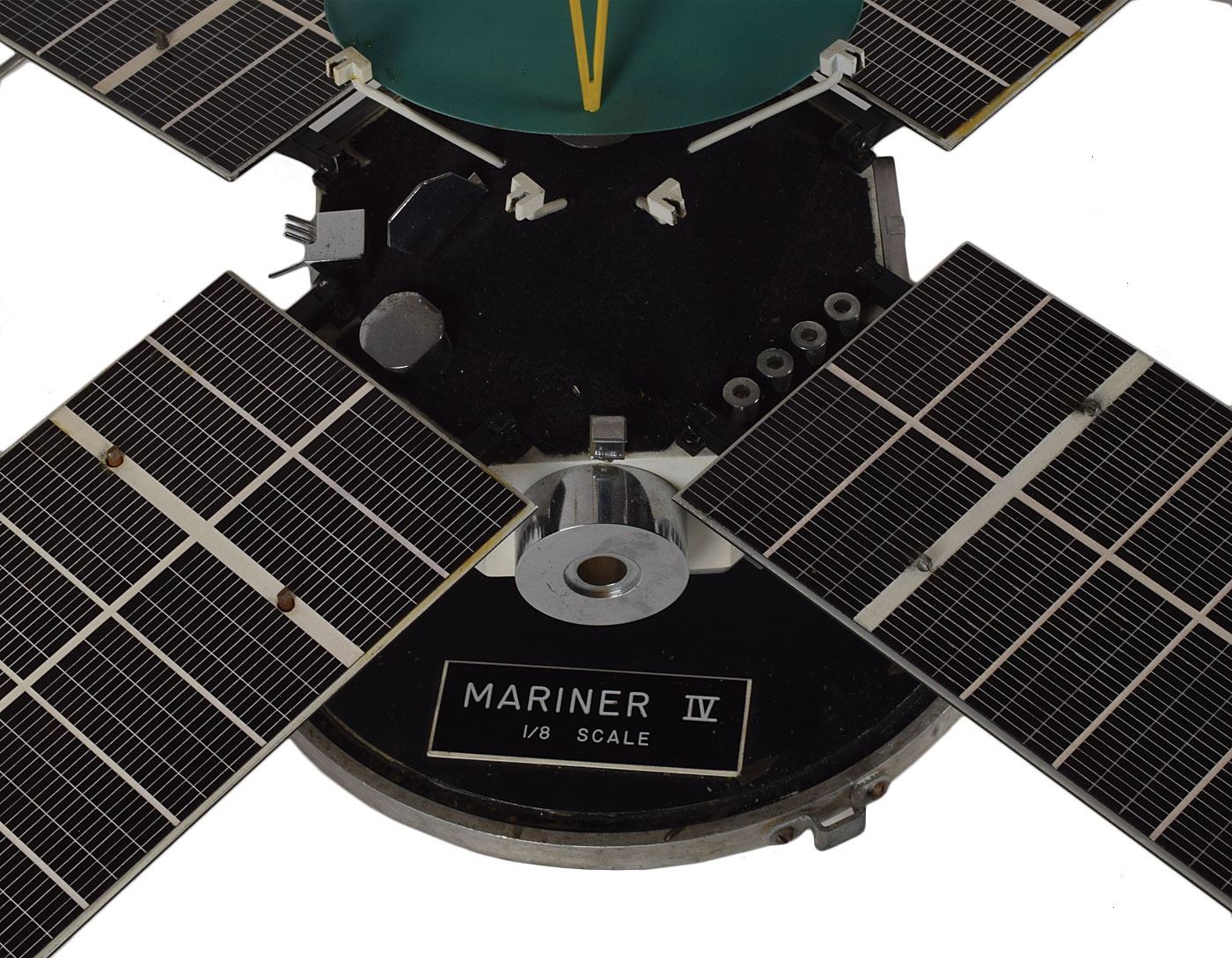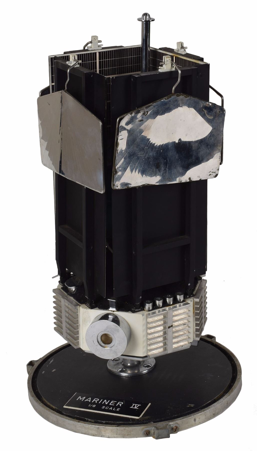 Vintage 1:8 scale model of the Mariner IV spacecraft, used by NASA as part of an outreach program during the late 1960s and early 1970s. When folded and stored within its original metal canister, the model measures approximately 15 x 6.5 x 6.5; when the four solar panels are lowered for display, the Mariner opens to an approximate measurement of 25 x 25. The model is suspended upon a 10? diameter base, which features a small engraved nameplate. The included storage canister measures 19.75? tall and is labeled in black stenciling: "Mariner IV, M–72–32." Additionally, the canister features a NASA 'meatball' logo sticker, a Dimensions Craft label, an Eastern Airlines shipping label, and a partial NASA receiving order addressed to the Manned Spacecraft Center in Houston, Texas, dated January 9, 1969. Handle on canister top bears original green tag. In very good to fine condition, with expected wear from use and storage, including: scattered light soiling, and some peeling to solar panels; the Mariner leans slightly upon its base, and one solar panel is detached but present. Designed to conduct close-up scientific observations of Mars and to transmit these observations to Earth, the Mariner 4 represented the first successful flyby of the planet Mars, returning the first pictures of the Martian surface, and the first images of another planet ever returned from deep space.