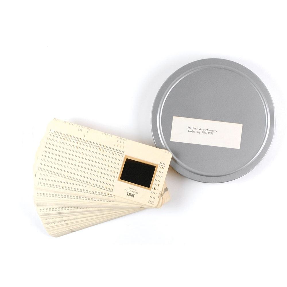 Two items from the Mariner interplanetary probe program: a collection of approximately 200 IBM Type D-1 All Purpose keypunch cards from 1963 associated with various Mariner components (e.g. "Emitter," "HTC Clock," "Mother Board," "Insulator," etc.), retaining negatives with schematics or listings of the spacecraft's components; and a canister of film, 7.25è in diameter, labeled on the cover, "Mariner Venus/Mercury Trajectory Film 1971," with animated diagrams of flight trajectories. In overall fine condition.