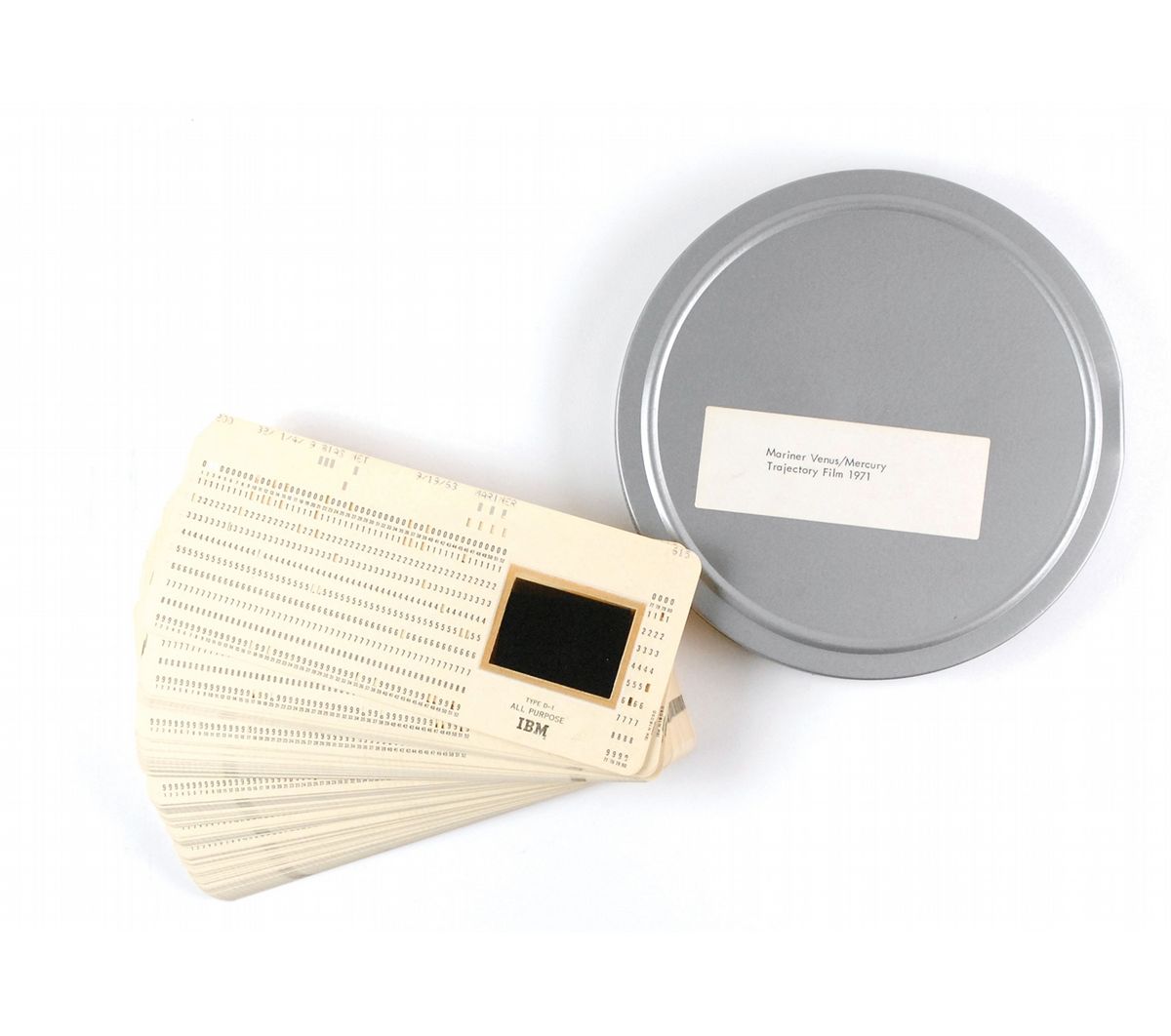 Collection of two items. An original canister of film, 7.25? in diameter, labeled on the cover, “Mariner Venus/Mercury Trajectory Film 1971; and a collection of approximately 200 1963 IBM keypunch cards of Mariner components, each retaining a negative of the spacecraft’s component. In fine condition.