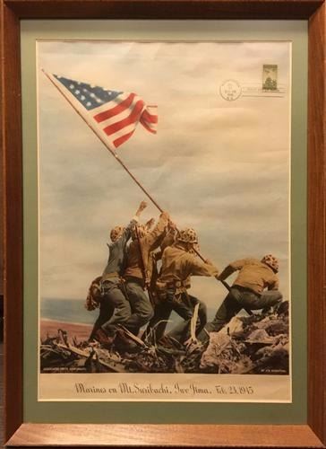 Very collectible vintage color print by Joe Rosenthal, entitled 'marines on Mt. Suribachi'. Depicted is the raising of the us flag on mount Suribachi by the us marines during world war ii. Comes with a unused first issue stamp as well. Size:25X19 inches.