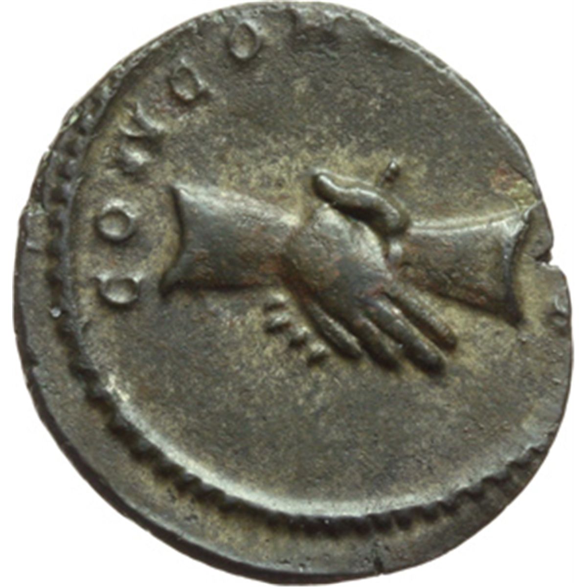 Impero Romano. Mario (268 d.C.). Antoniniano, Colonia. D/ IMP [C] MARIVS PF AVG. Busto radiato, drappeggiato e corazzato a destra. R/ CONCORD[IA MILITVM]. Due mani che si stringono. RIC 7/8. AE. g. 2.89 mm. 19.00 R. Raro. Bella patina cuoio. qSPL.