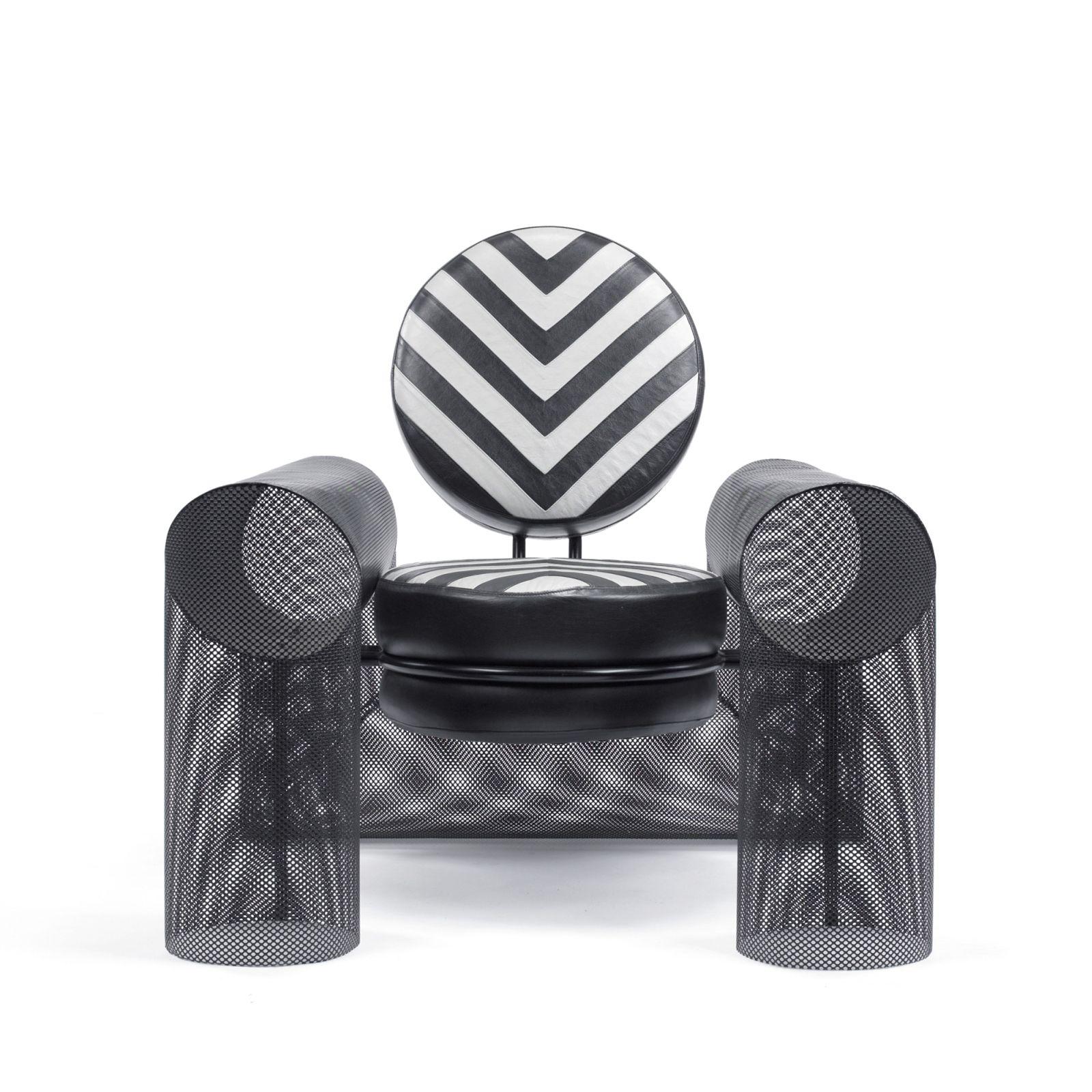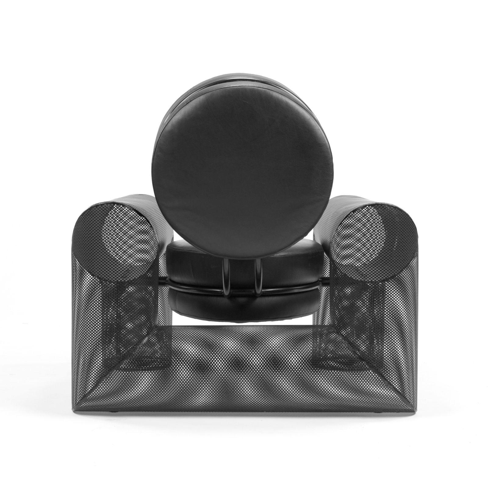 enameled and perforated metal, leather