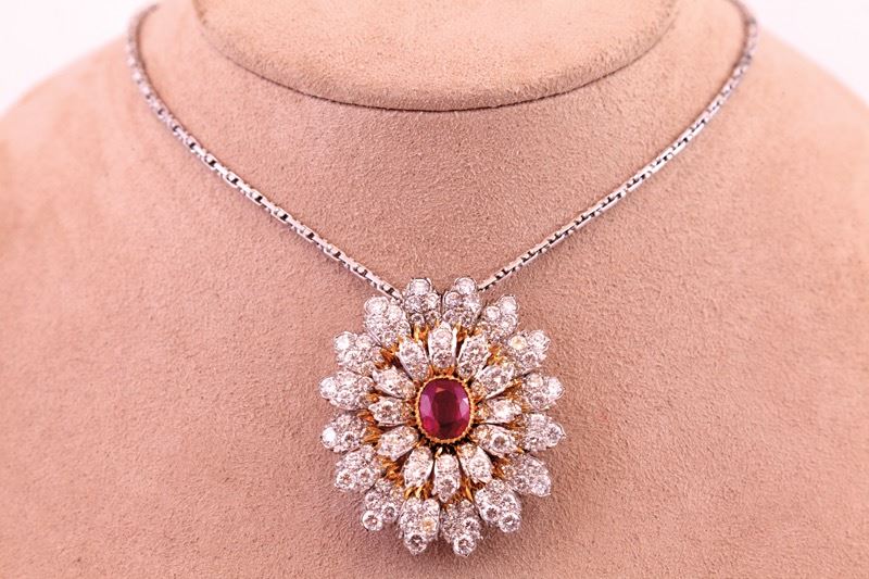 Description: 2.93 carat -no heat" Burma oval cut Ruby, 104 Diamonds weighing 12.00 carats total, 18 Karat Two-Toned Gold, gross weight of 37.30 grams, 37.5 inches in length (all weights approximate).
