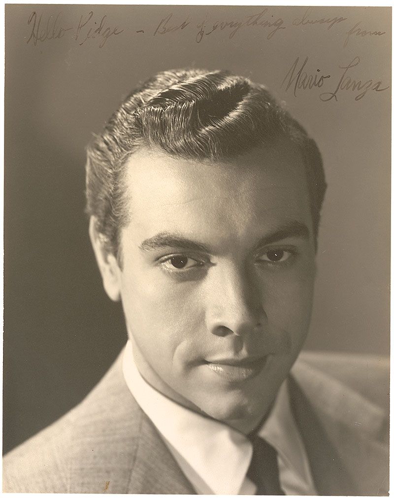 Dashing vintage matte-finish 7.25 x 9.25 head-and-shoulders photo of Lanza in a suit and tie, signed and inscribed to assistant director George Rhein in fountain pen “Hello Pidge—best of everything always from, Mario Lanza.” In fine condition, with trimmed edges (more pronounced to top and left edges), and sentiment a shade lighter than signature.