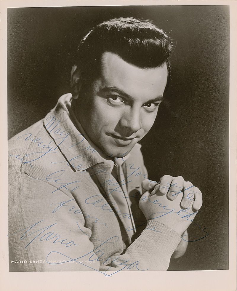 Vintage glossy 8 x 10 MGM publicity photo, signed in blue ballpoint, “May I wish you the very best of everything in life always from Mario Lanza.” In fine condition, with some scattered light creases and surface marks and some light contrast to portions of sentiment.
