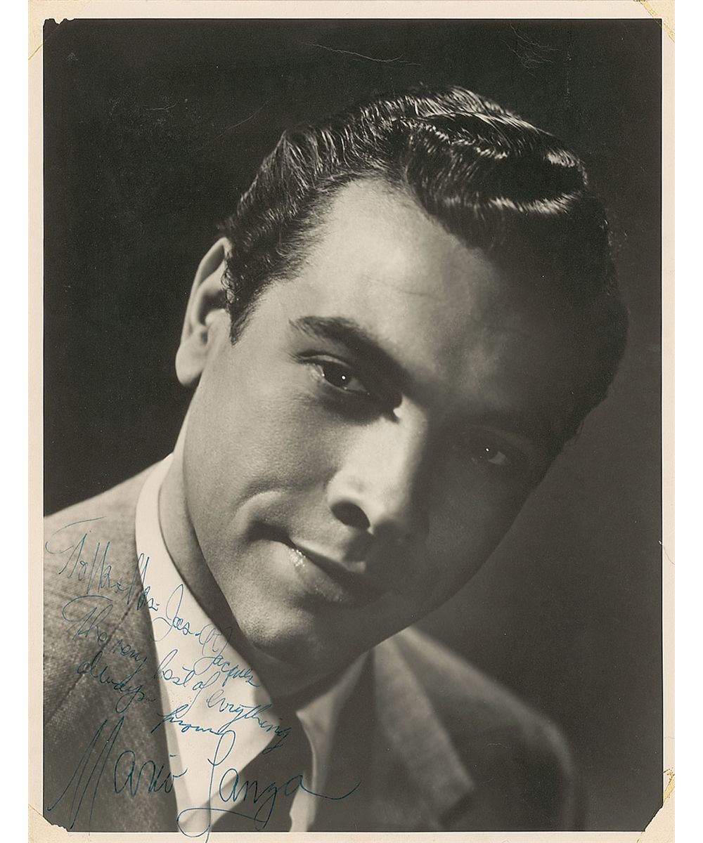 Matte-finish 10 x 13 head-and-shoulders photo, signed and inscribed in blue ballpoint, “To Mr. & Mrs. Jas. A. Jacques, The very best of everything always from Mario Lanza.” Surface loss to corner tips, mild rippling along bottom edge, and some creases to background, otherwise fine condition.