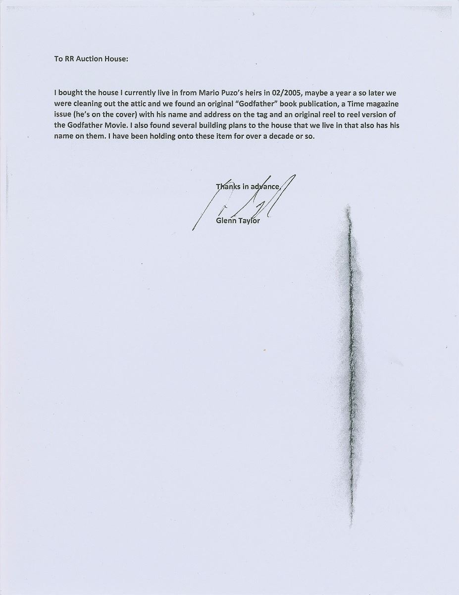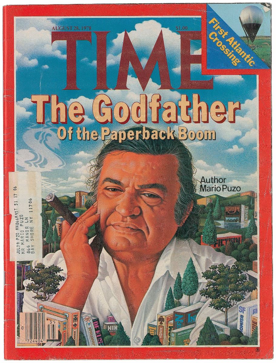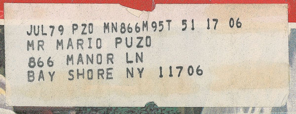 Mario Puzo’s Time magazine from August 28, 1978, 8.25 x 11, 76 pages, showing an artistic depiction of the novelist with a smoking cigar on the front cover. Label vertically affixed along left edge bears Puzo’s address, “866 Manor Ln., Bay Shire, NY, 11706.” In fine condition, with a small tear to upper right corner tip. Accompanied by a copy of a letter of provenance, in part: “I bought the house I currently live in from Mario Puzo’s heirs in 02/2005, maybe a year a so later we were cleaning out the attic and we found...a Time magazine issue...with his name and address on the tag.”