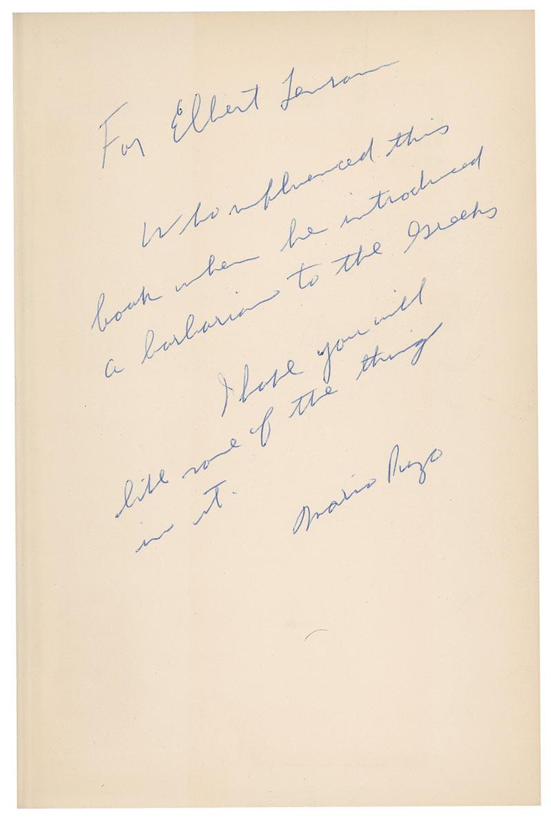 Signed book: The Dark Arena. First edition. NY: Random House, 1955. Hardcover with dustjacket, 5.5 x 8.25, 308 pages. Signed and inscribed in blue ballpoint on the first free end page: “For Elbert Lenrow, Who influenced this book when he introduced a barbarian to the Greeks. Hope you will like some of the things in it. Mario Puzo.” Edge toning, an area of soiling to the end pages, pencil notation to the inside board, some wear to the dustjacket, and toning to the half-title page, otherwise fine condition. Accompanied by eight course cards filled out by Puzo for various literature courses taught by Lenrow at the New School for Social Research between 1949 to 1954.