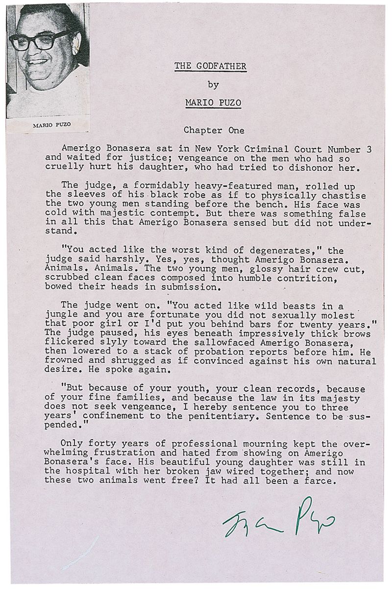 Souvenir typescript, one page, 6.75 x 10.5, beginning: “Amerigo Bonasera sat in New York Criminal Court Number 3 and waited for justice; vengeance on the men who had so cruely hurt his daughter, who had tried to dishonor her.” Signed at the bottom in green ink by Puzo, with a small clipped photo affixed to top left. Typescript is affixed to an identical size sheet of cardstock. In fine condition, with slightly trimmed edges.