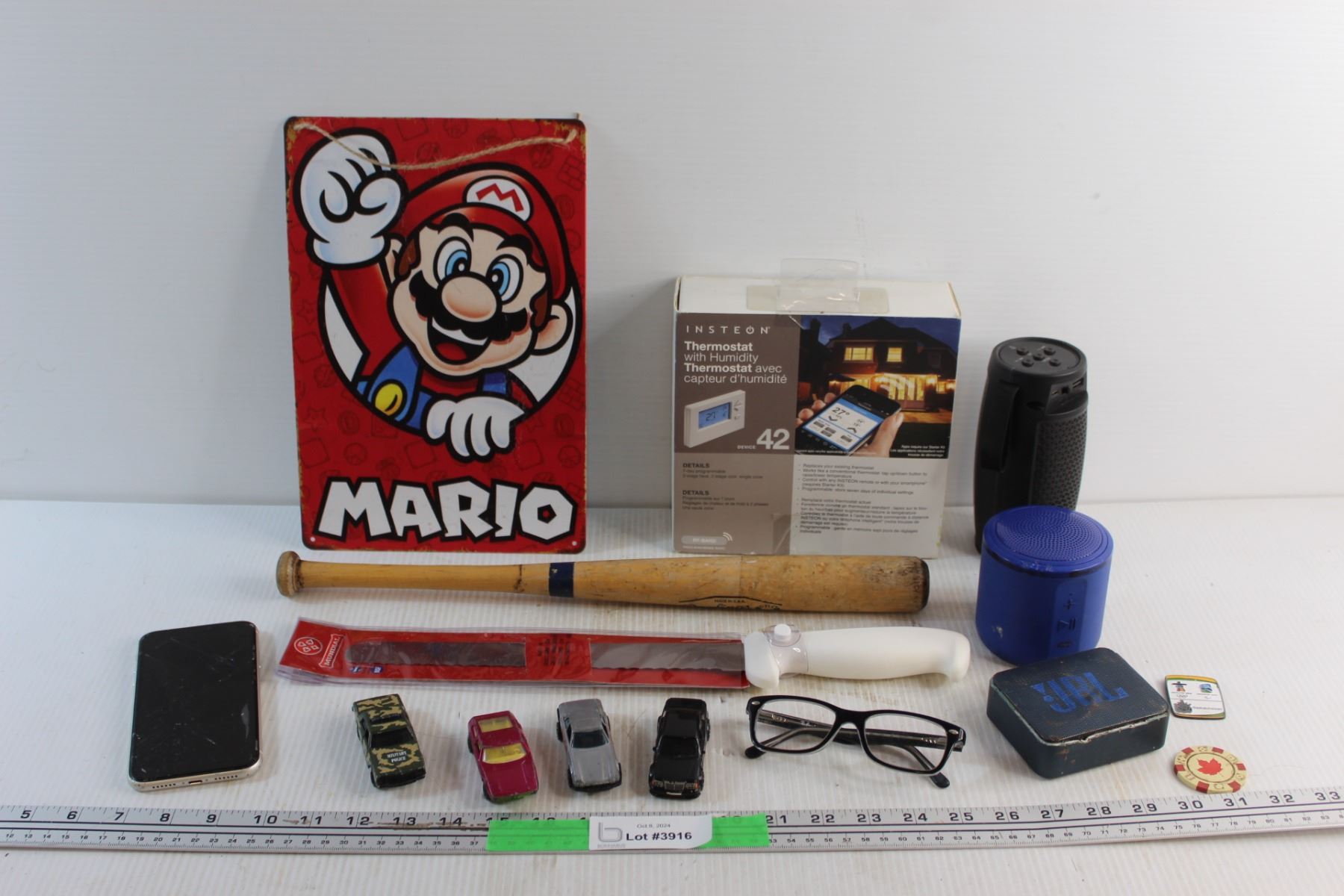 Mario Sign, iPhone 11 - As Is, JBL & Misc. Portable Speakers, Bread Knife and Assorted Items