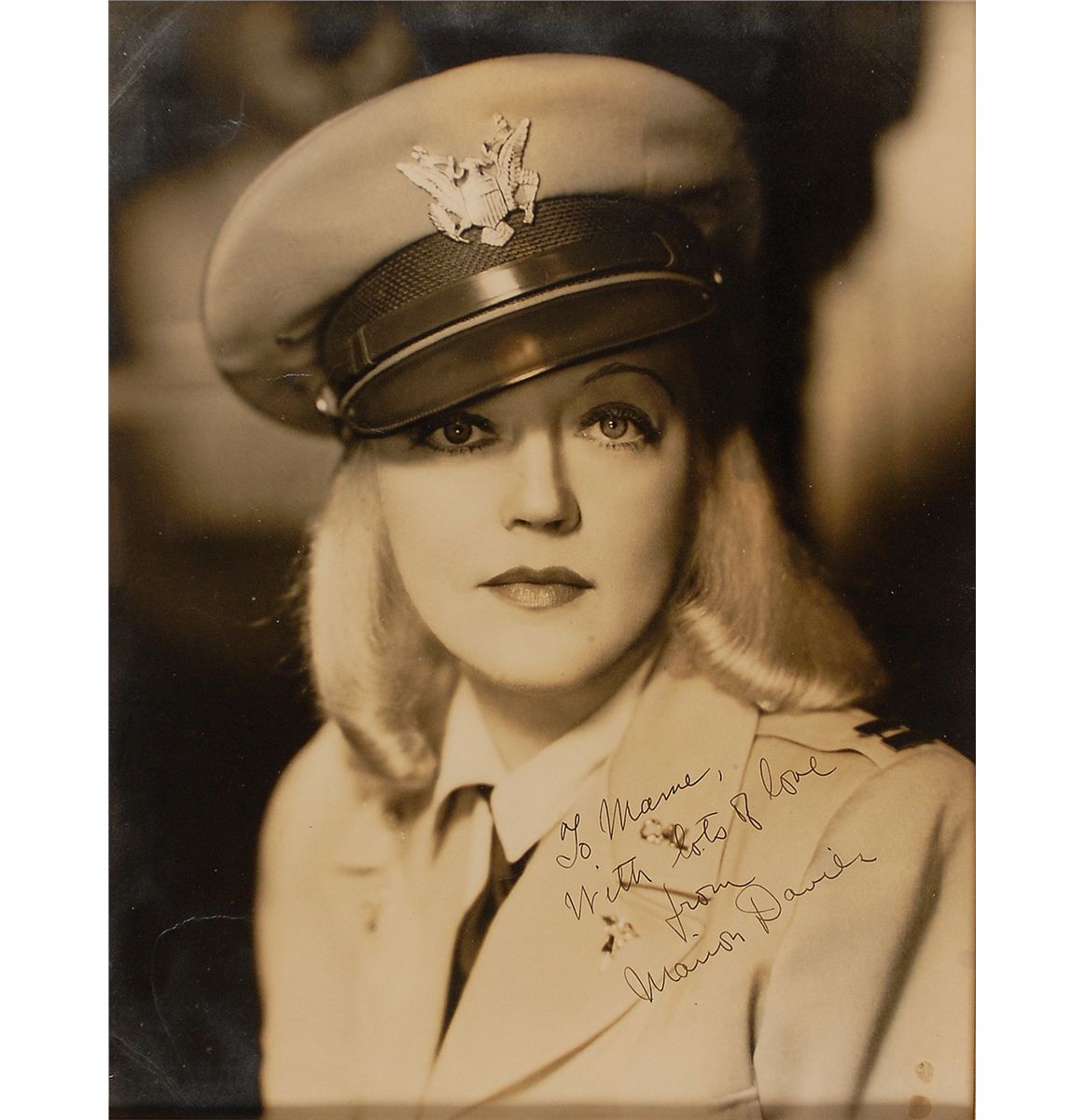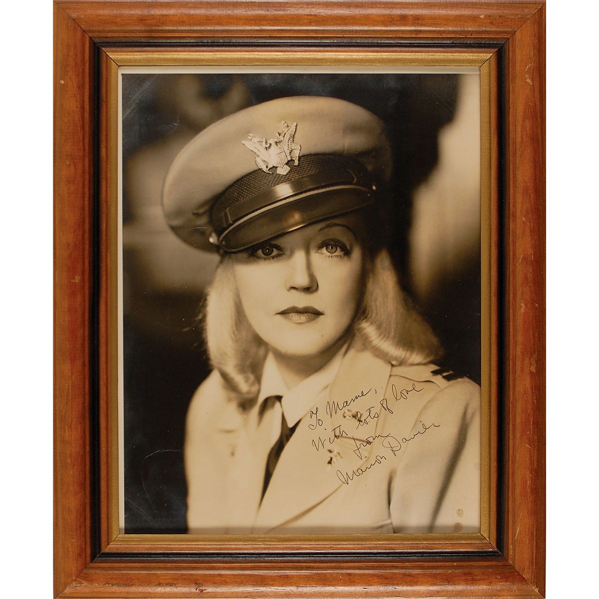 Popular early film comedienne (1897–1961) who became infamous as the longtime intimate companion of married publishing tycoon William Randolph Hearst. Vintage oversized matte-finish 10.5 x 13.5 photo of Davies in military uniform, signed and inscribed in fountain pen “To Mame, with lots of love from Marion Davies.” Framed to an overall size of 14.5 x 17.5. In very good condition, with scattered creases, primarily to background, scattered silvering to edges and background, and a few spots to lower right.