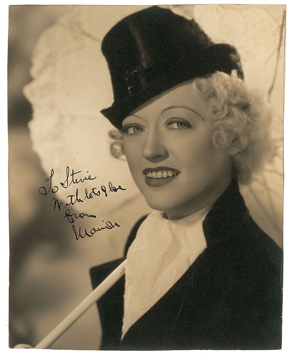 Pretty vintage matte-finish 8 x 10 publicity photo, signed and inscribed in fountain pen, “To Stevie, with lots of love, from Marion.” In fine condition, with slightly trimmed edges. Accompanied by a certificate of authenticity from PSA/DNA. Provenance: William Collier Family Collection.