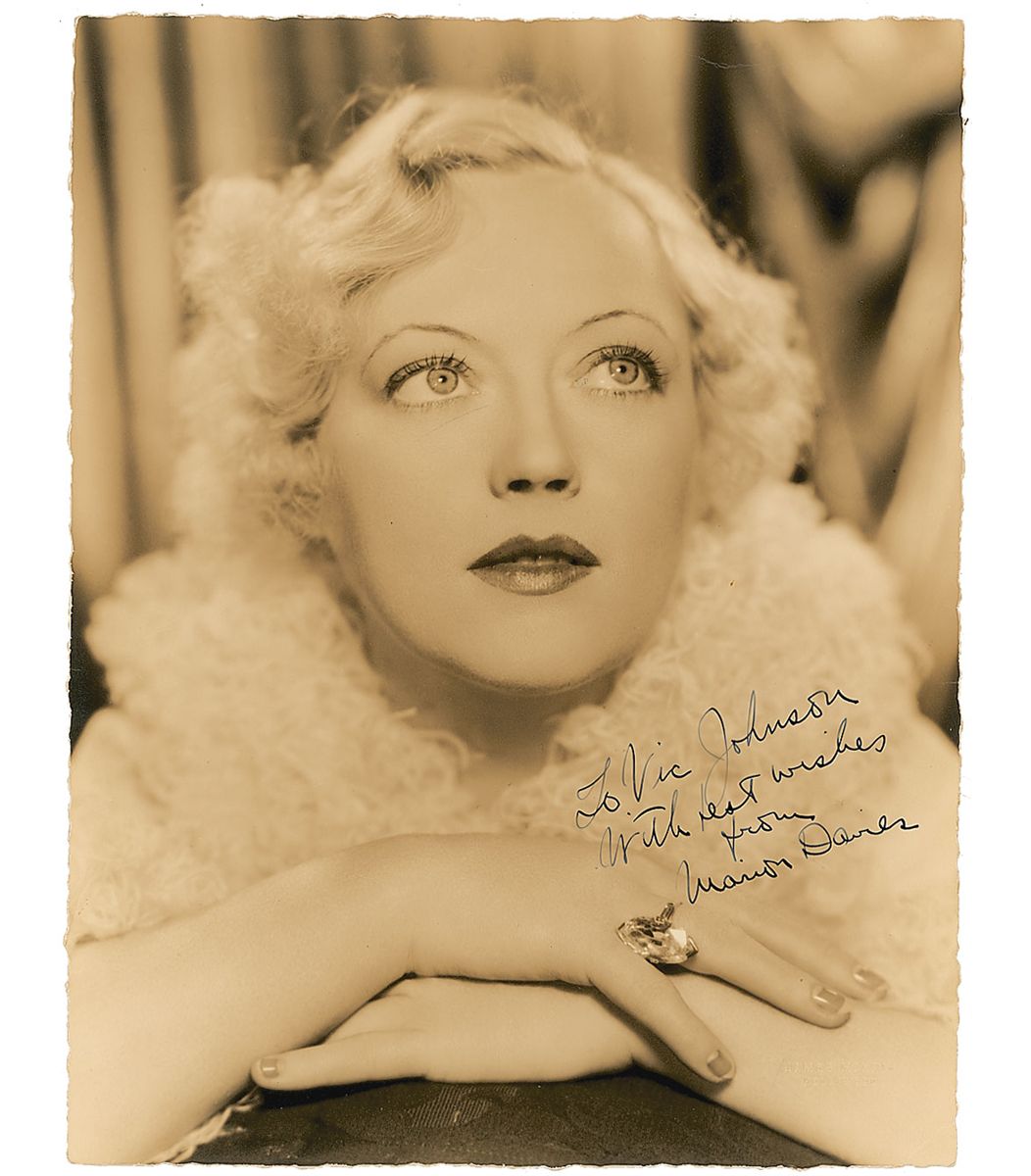 Vintage matte-finish 10.25 x 13.5 photo, signed and inscribed in fountain pen, “To Vic Johnson, with best wishes, from Marion Davies.” Blindstamped in the lower right by Hollywood photographer James Manatt. In fine condition. Originates from the personal collection of Victor Johnson, who worked as a gaffer at Warner Bros. for over forty years.