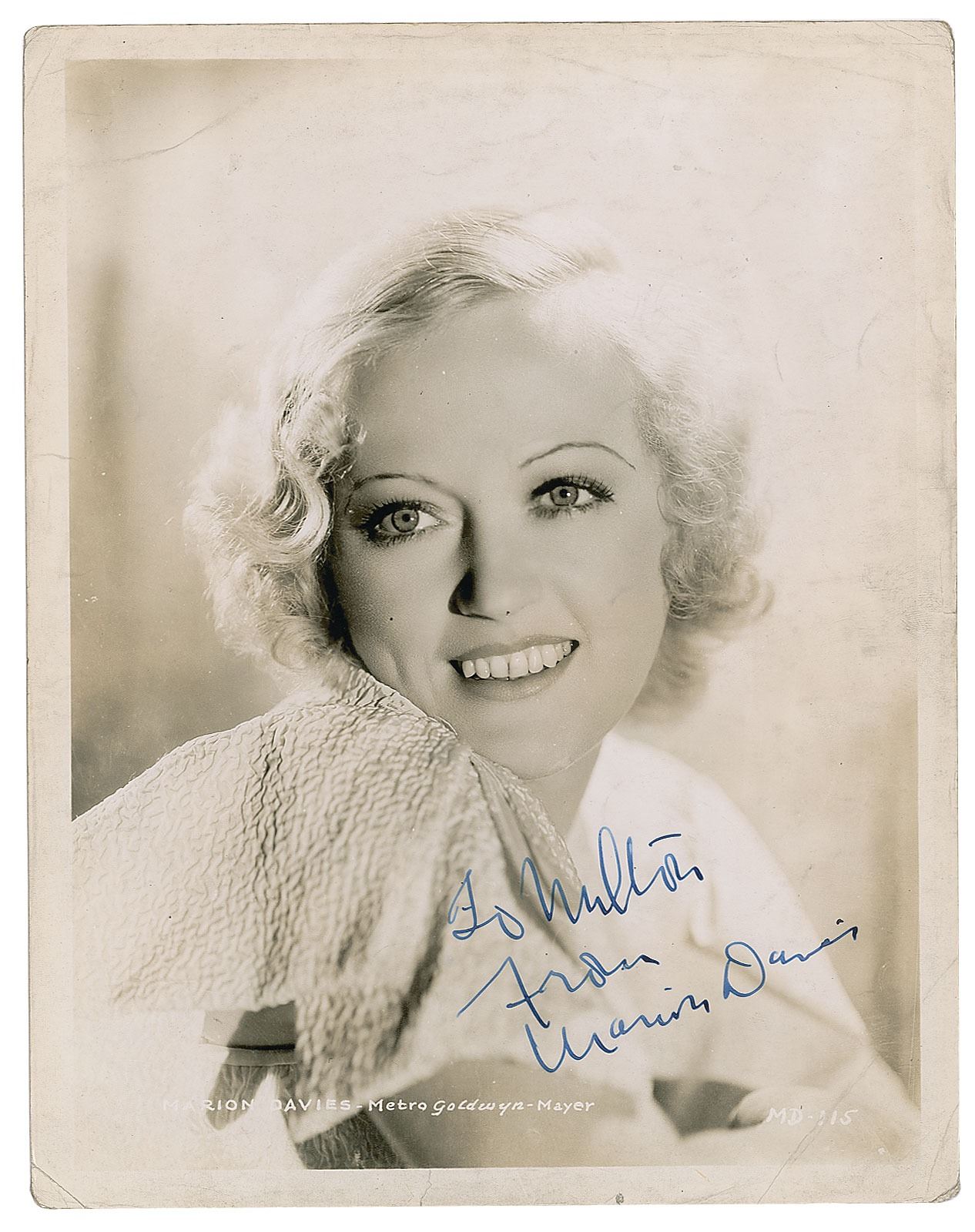 Vintage glossy 8 x 10 Metro-Goldwyn-Mayer studio portrait of Davies smiling over her shoulder, signed and inscribed in fountain pen, "To MIlton, from Marion Davies.” In very good condition, with overall rubbing to the emulsion, and some creasing, primarily to the perimeter.