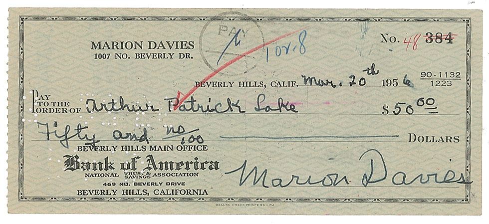 Personal check, 6.25 x 2.75, filled out and signed by Marion Davies, payable to Arthur Patrick Lake for $50, March 20, 1956. In fine condition. Arthur Patrick Lake was the son of socialite, actress, and radio comedian Patricia Lake and Blondie actor Arthur Lake.