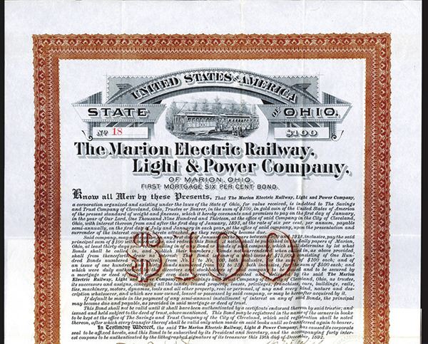 OH. $100 Gold Coupon Bond. Issued. Uncancelled. Many coupons remain. VF+