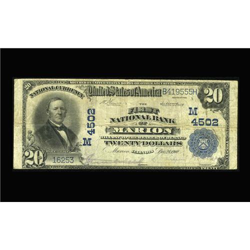 <B>Marion, IL</B></I> - $20 1902 Plain Back Fr. 653 <B>The First NB</B></I> Ch. # (M)4502<BR>A decent <B>Fine</B></I> example from the sole bank here to issue.