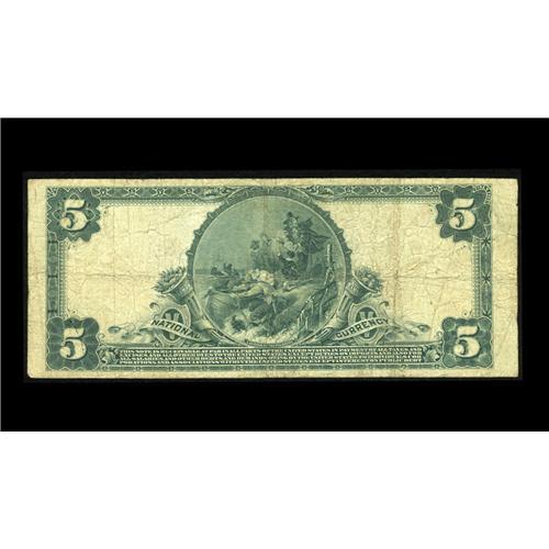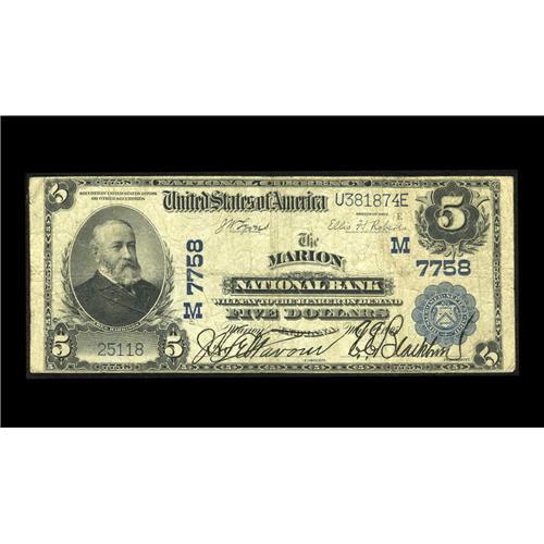 <B>Marion, IN</B></I> - $5 1902 Plain Back Fr. 598 <B>The Marion NB</B></I> Ch. # (M)7758<BR>This note and the following two examples are a window into the history of The Marion National Bank. The Signatures on these three notes are all different and all engraved. The different signatures suggest at least four different shipments of large size notes to the bank between its opening in 1905 and introduction of small size notes in July of 1929. The first shipment and presumable immediate shipment was Red Seals delivered to the bank between 1905 and 1908. The next shipment was Date Backs sometime between 1908 and 1915. The note offered in this lot was delivered to the bank between 1915 (the end of the Date Back period) and 1924 (the last year of geographical letters). This note graded <B>Fine</B></I> has a couple small pinholes in the portrait but is otherwise solid, attractive, and well margined.