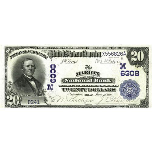 <B>Marion, OH</B></I> - $20 1902 Date Back Fr. 642 <B>The Marion NB</B></I> Ch. # (M)6308<BR>This $20 has dark inks, embossing, nicely stamped signatures, and white paper to go along with its original surfaces. <B>Extremely Fine+.</B></I>