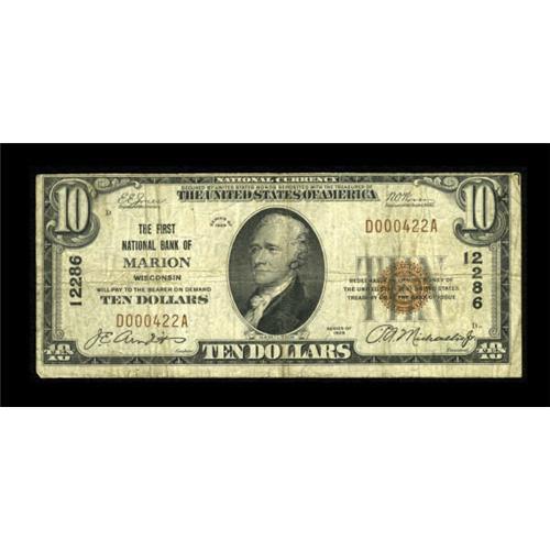 <B>Marion, WI</B></I> - $10 1929 Ty. 1 <B>The First NB</B></I> Ch. # 12286<BR> A scarce Waupaca County note. <B>Very Good-Fine.</B></I><BR><I>From The Kansas City Collection.</B></I><BR><BR><b>Shipping:</b> Coins & Currency (<a target="_blank" href="http://www.heritageauctions.com/common/shipping.php">view shipping information</a>)