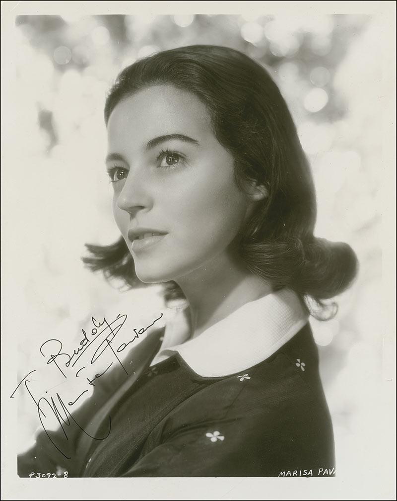 Vintage glossy 8 x 10 portrait of an innocent-looking Pavan, signed and inscribed in fountain pen “To Buddy, Marisa Pavan.” In fine condition, with light vertical bend and a few scattered surface marks.