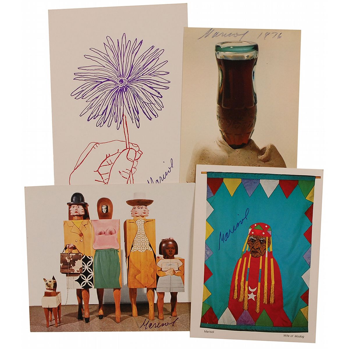 Four items: three color postcards of Marisol’s works, one 6 x 5.25 and two 4.5 x 6.25, each signed on the front in felt tip; and a greeting card, 5 x 7, featuring a work by Marisol on the front, signed on the front in purple felt tip. In fine condition, with irregular ink adhesion to one postcard.