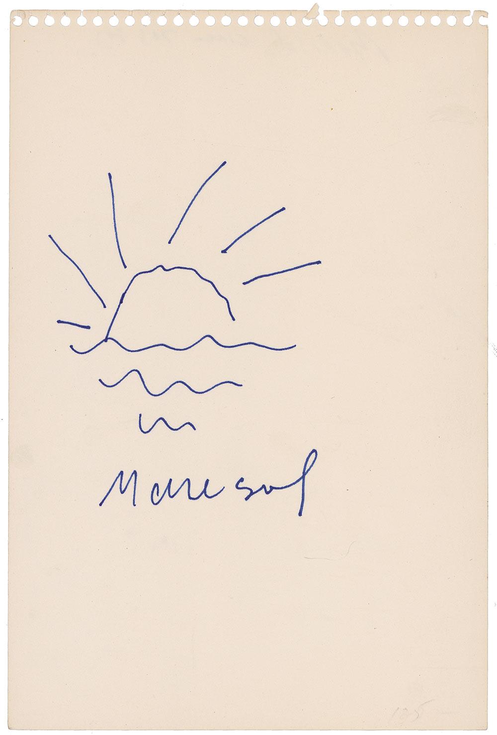 Original signed felt tip sketch of a sunset over the water on an off-white 6 x 9 sheet. In fine condition.