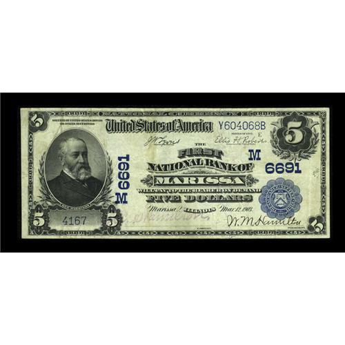 <B>Marissa, IL</B></I> - $5 1902 Plain Back Fr. 598 <B>The First NB</B></I> Ch. # (M)6691<BR>This bank was reorganized and rechartered in 1933 under the same name. A pleasing mix of stamped and pen signatures is noticed. Bright <B>Very Fine,</B></I> from an always in demand location.<BR><I>From The Lincoln Collection</B></I><BR><BR><b>Shipping:</b> Coins & Currency (<a target="_blank" href="http://www.heritageauctions.com/common/shipping.php">view shipping information</a>)