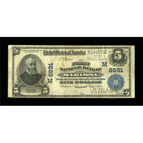 <B>Marissa, IL</B></I> - $5 1902 Plain Back Fr. 598 <B>The First NB</B></I> Ch. # (M)6691<BR> The last note we sold from here of this type realized $2041.25. Though that example was a touch better, expect this <B>Fine-Very Fine</B></I> example to realize in the area of...<BR><BR><b>Shipping:</b> Coins & Currency (<a target="_blank" href="http://www.heritageauctions.com/common/shipping.php">view shipping information</a>)