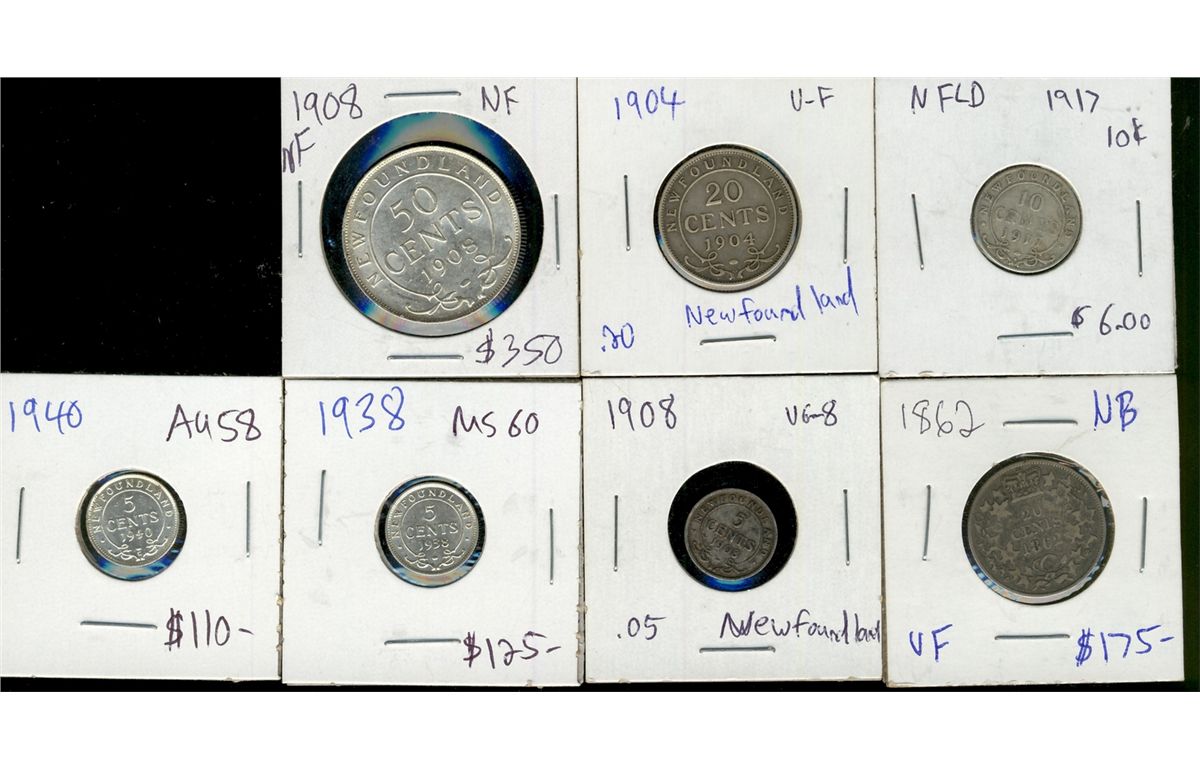 Maritime Coin Lot; includes N.B. 1862 20¢, NFLD 1908 5¢, 1938, 1940, 1917c 10¢, 1904H 20¢ & 1908 50