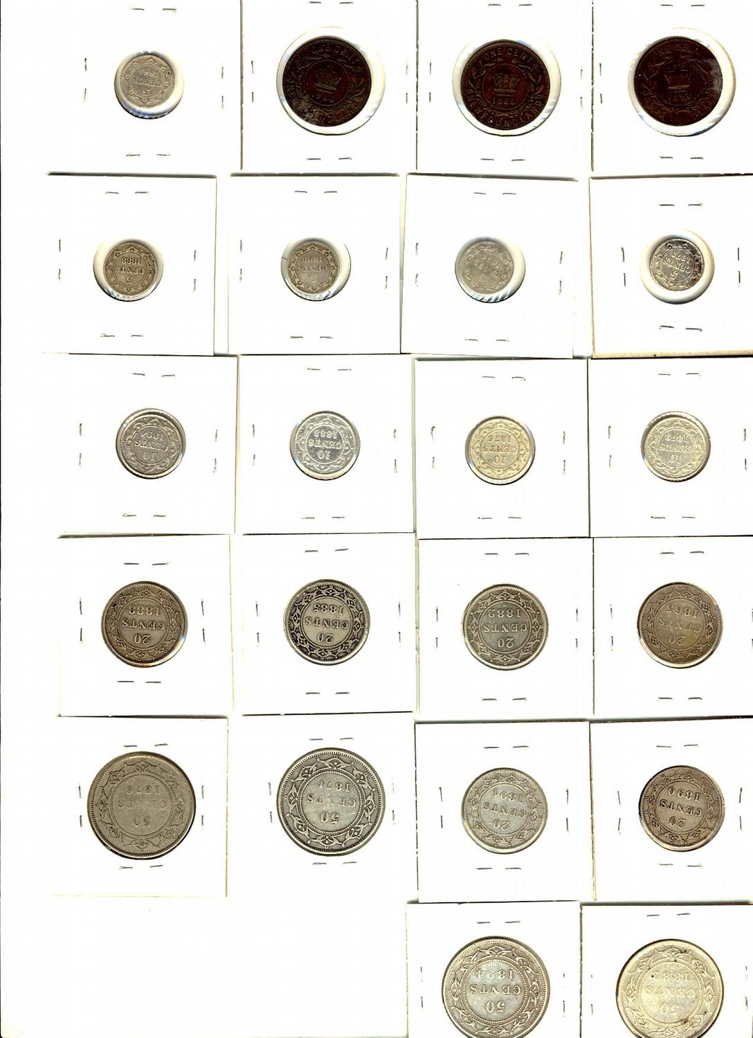 Maritimes, Newfoundland coin Album. Includes Individual sheets of Nfld 1¢, 5¢, 10¢, 20¢ & 50¢ from different periods. Includes 1865-1896(11pcs) 1¢, 1865-1896(13) 5¢, 1865-1896(11) 10¢, 1865-1900(17), 1870-1900(16) 50¢ along with a variety of Edward VII