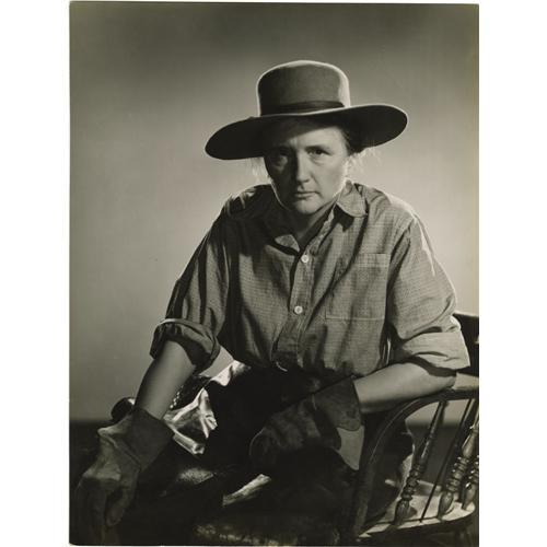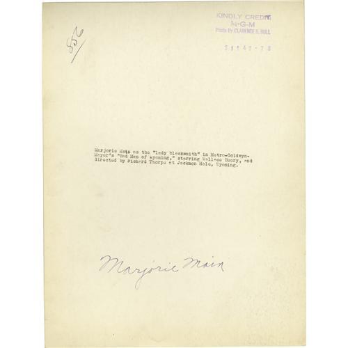 <B>Marjorie Main 11" x 14" Photograph by Clarence Sinclair Bull.</B></I> Historians and collectors usually associate the name of Clarence Sinclair Bull with his sumptuous glamorous portraits of MGM's most alluring stars. Was Marjorie Main alluring? Well...no, but she certainly had character, and Bull captures her delightful, no-nonsense personality in this 11" x 14" portrait from <I>Bad Man of Wyoming,</B></I> a 1940 MGM feature in which Marjorie appeared with Wallace Beery. The picture presents Marjorie in "lady blacksmith" attire, and the verso has Bull's stamp and a typed caption. A wonderful study of the actress who later became Hollywood's "Ma Kettle." Excellent condition.<BR><BR><b>Shipping:</b> Flat Material, Small (<a target="_blank" href="http://www.heritageauctions.com/common/shipping.php">view shipping information</a>)