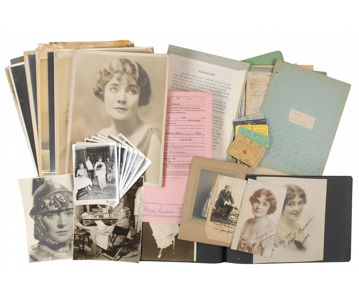 Prolific American film and stage actress (1889–1970). Large archive of Marjorie Rambeau materials. Highlights of the lot are a freelance contract and four of her Screen Actors Guild membership cards. Contract is a DS, one page, 8.5 x 14, April 23, 1953. Agreement between Rambeau and Columbia Pictures for her to "render services…in the role of Mrs. Nelson, in a photoplay, the working title of which is ‘Scalpel.’” Signed at the conclusion in blue ballpoint by Rambeau. The Screen Actors Guild membership cards are dated 1955, 1956, 1957, and 1957–58, and hold an image of her driver's license. Another great piece is a custom-bound hardcover book containing approximately 100 glossy stills from her films, many with photographs stamps or press captions affixed to reverse. Another highlight is a collection of 14 oversized photos, all approximately 11 x 14, including two Clarence Sinclair Bull portraits of Rambeau (one signed by her), as well as 20 other photos of various sizes, including two cabinet-type portraits from early in her career. There is also a scrapbook with approximately 95 candids and publicity photos affixed within, a few signed. Also includes over one hundred news clippings, reviews, and articles about Rambeau from throughout her career. Also present in the lot are a vintage matte-finish 7.5 x 9.5 photo of Jack Joy, signed and inscribed to Rambeau in white ink, and two TLSs from screenwriter Eleanore Griffin on 20th Century Fox letterhead. Other items are: four typed manuscripts by her husband, Francis A. Gudger, including a script, two stories, and a lecture; five typed manuscripts of short stories by Charles Owen; and a transcript from Ronald Reagan's television appearance November 4, 1962. In overall very good to fine condition, with many of the oversized photos exhibiting water damage to the top.