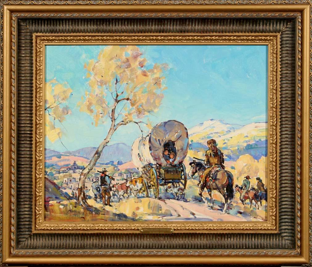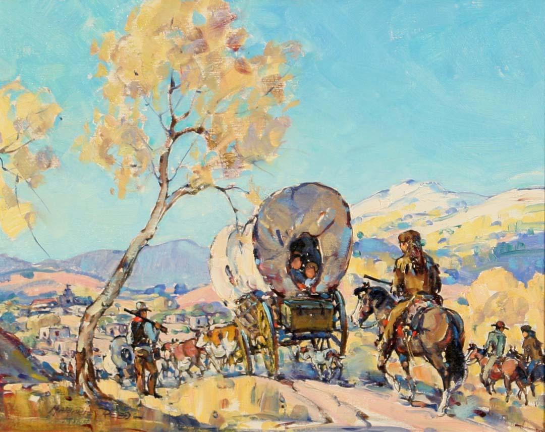 Marjorie Reed (1915-1996). Entering Santa Fe On The Emigrant Trail. 16" x 20" oil on canvas. Signed lower left. (est $2,500-$3,500). For condition reports please visit: www.auctioninsantafe.com/cr2011.pdf