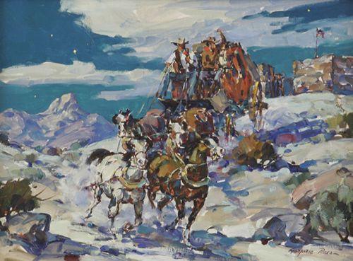 Marjorie Reed. (1915-1997). "The Butterfield Mail Leaving Cooke's Spring Station". 12" x 16". Oil. (est $2,000-3,000).