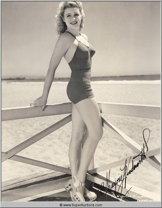 Marjorie Woodworth Original Autographed 8 x 10 Black & White photograph in swimsuit (Photograph is creased) {Marjorie Woodworth Collection}