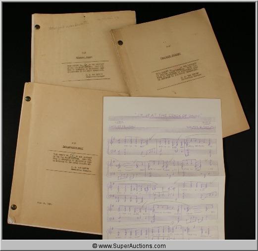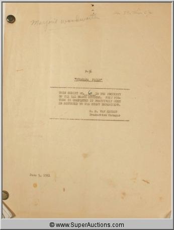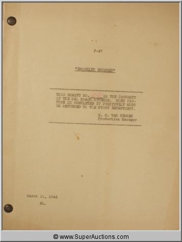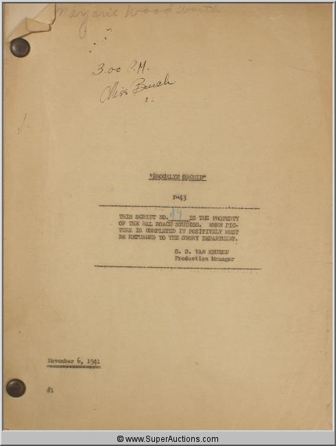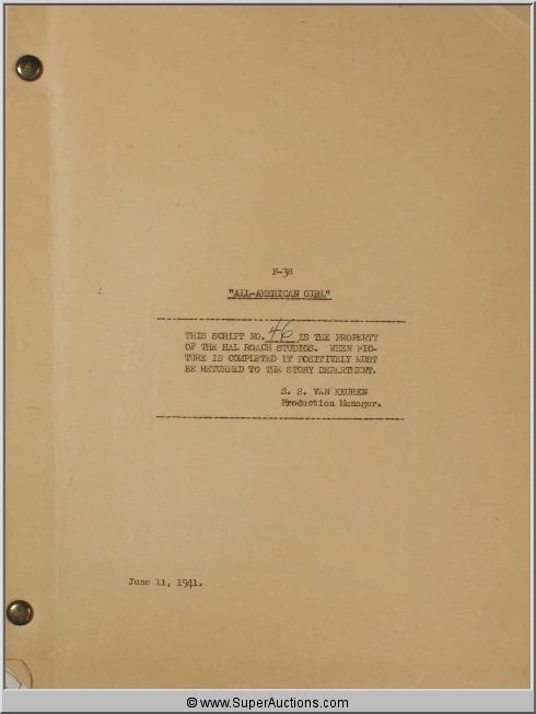 Marjorie Woodworth Script Collection ~"All-American Girl" June 11, 1941 ~ F-38 Script #46, Hal Roach Studios / "Brooklyn Bridget" March 11, 1942 ~ F-47 Script #60, Hal Roach Studios / "Niagara Falls" June 5, 1941 ~ F-36 Script #6 ~ Hal Roach Studios / "Cubana" December 1, 1941 {In Cover Labeled "Flying With Music"-Hughes Productions} / "Broadway Limited" December 4 1940~ F-34 #67 Hal Roach Studios {Also Included ~ Partial Pages Dated December 4, 1940, Partial Pages Dated January 7, 1941} / "Brooklyn Orchid" November 6, 1941 ~F-43 #49 Hal Roach Studios