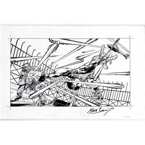 <B>Mark Bagley and Al Vey - Spider-Man Vs. Hammerhead Splash Page Original Art (undated).</B></I> Spider-sense and spider-speed save the wondrous wall-crawler from a deadly crossfire unleashed by Hammerhead and a hovering helicopter. Mark Bagley captures the unique thrill of watching Spider-Man in action and Al Vey's inks add the perfect finish to this pulse-pounding drawing. The image area of the piece is 14" x 8", and the art is in Excellent condition. Mark Bagley has signed the art in the border at the lower right.