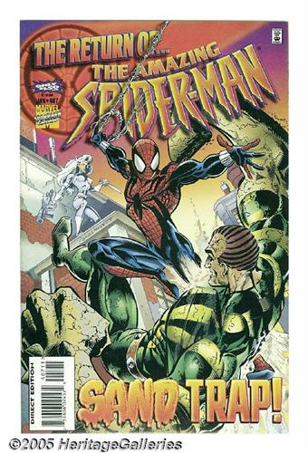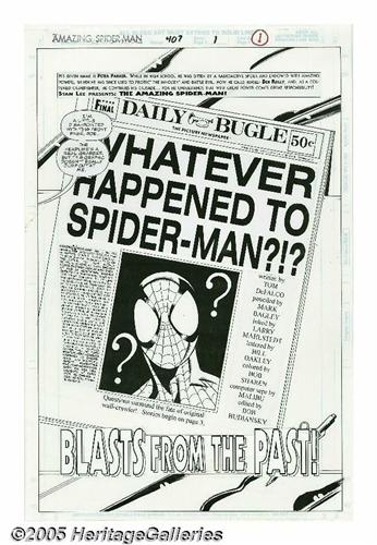 <B>Mark Bagley and Larry Mahlstedt - Amazing Spider-Man #407, Splash page 1 Original Art (Marvel, 1996).</B></I> Whatever happened to Spider-Man? This engaging splash page is by the artist who went on to define Spidey in the new Millennium, Mark Bagley, and features an innovative opening to the story, "Blasts From the Past!," which was written by Tom DeFalco. An amazing Bagley-Mahlstedt page with an image area of 10" x 15," this piece also includes all the original title, and masthead paste-up art. One small stain on the title type, otherwise the art is in Excellent condition. Includes a copy of <B>Amazing Spider-Man</B></I> #407.
