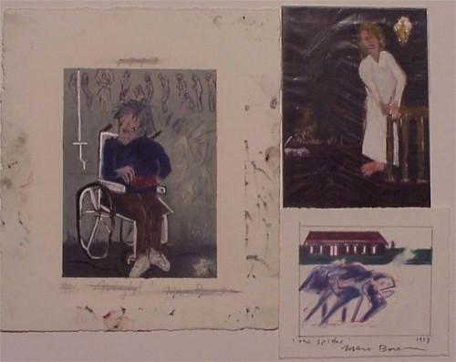 Mark Baseman (20th Century) American (three) WOMAN WITH RED SOCKS, oil painting on paper with text on verso, 5 1/2 x 4"; WOMAN AT TOP OF STAIRS, 1998, oil painting on paper, 5 1/2 x 4", signed on verso; SPIDER, oil and color pencil on paper, 4 x 4 1/2", all signed. (3)
