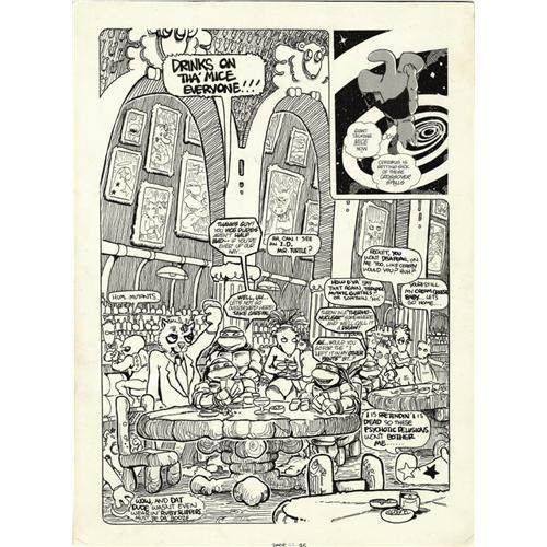 <B>Mark Bodé, Dave Sim, Kevin Eastman, Larry Todd, and Bill Fitts - Miami Mice #4 Panel Page 25 Original Art (Rip Off Press, 1987).</B></I> This special jam page, from the last issue of Mark Bodé's <B>Miami Mice</B></I> series, features a wonderful guest appearance by Cerebus, in a panel drawn by Dave Sim. Also, look closely at the large banquet panel for special guests like the TMNT characters, Cheech Wizard, Cobalt 60, Dr. Atomic, and more. The 11" x 15" page is drawn in ink and marker on bristol board, and is in Excellent condition. <BR><BR><B>Important notice:</B> Heritage usually auctions material at the rate of 200-250 lots per hour. On some occasions eBay Live bid software or the Internet may not be able to keep up with the pace of the auction. We recommend placing a realistic absentee bid now as insurance to avoid disappointment. Occasionally the auctioneer may eliminate or reject an eBay Live bid, and the auctioneer may also reopen a lot after the close of the eBay live bidding (usually because we missed an audience bid), and may reject your bid even if it shows you as the winning bidder. By bidding via eBay Live, you agree that Heritage may award the lot to another bidder at its sole discretion under the circumstances described above or any other reasonable circumstances. Since eBay bids are not shown to us until we open the lot on the floor, we treat those bids just like floor bids. In most cases the floor responds before the eBay bid is presented to us, due to Internet lag time, so for consistency we have made it a policy that floor bids are always considered first over tie eBay live bids. Also please note that all Heritage lots purchased through eBay Live carry a 22.5% Buyer's Premium. Please make sure you read the Terms and Conditions before you bid. This lot is being auctioned in conjunction with a live floor auction by Heritage Auction Galleries. All final auction and invoice information will be supplied by Heritage Auction Galleries, and all other information should be considered preliminary. Lot:41001 <BR><BR><B>Winning Notification and Billing:</B> After the FINAL session in this auction is complete, Heritage will send e-mail and snail mail invoices. This process normally takes several days. All final auction and invoice information will be supplied by Heritage Auction Galleries, and all other information should be considered preliminary. <BR><BR>This auction will be conducted on a live auction floor and over the Internet through eBay Live. If you choose to place an absentee bid, please take a moment to <font color='#0000ff'><u><a href='http://pages.ebay.com/liveauctions/help/before/laabsentee.html'>learn how eBay Live absentee bidding works</a></u></font><font color='#000000'>