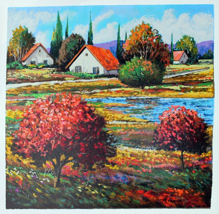 Artist: Mark Braver - Title: Backyard Pond - Medium: Serigraph on Fine Art Paper - Signature: Hand-signed by the Artist - Limited Edition: 550 - Image Size: Approximately 17.25 inches x 18 inches - Paper Size: Approximately 19.25 inches x 19.5 inches - Framed: Unframed - Details: This work comes with a Certificate of Authenticity - Mark Braver's Artwork Is Unique In Its Vivid Colors And Special Textures. His Compositions Come To Life On The Canvas In An Abundance Of Colors While His Unique Layering And Texturing Techniques Lend The Paintings An Unusual Quality.