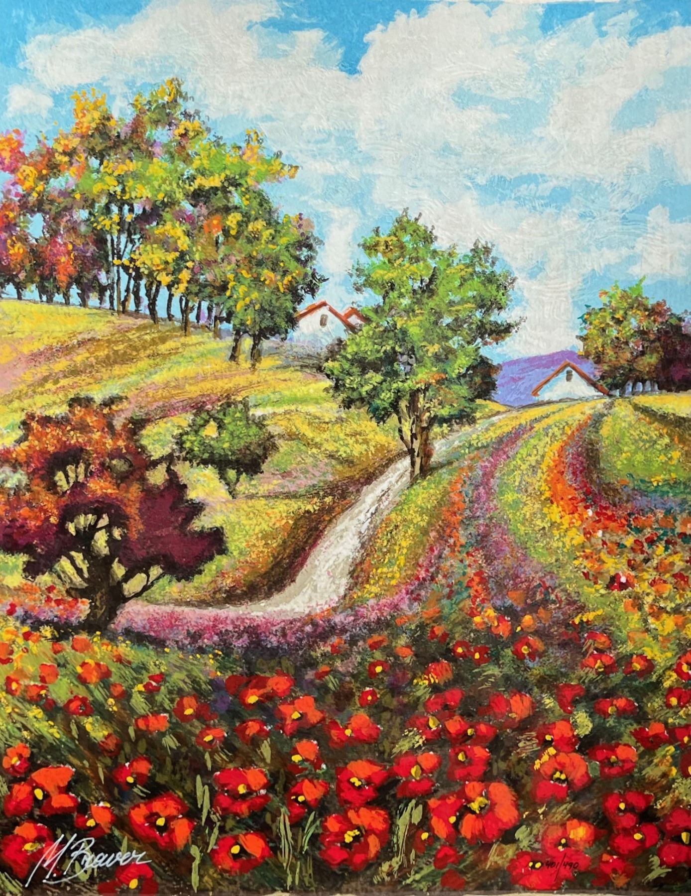 This is a hand signed serigraph by Mark Braver titled Poppy Landscape. Beautiful art piece on extra thick arches paper. Image measures: 16 inches x 12.5 inches. Paper measures: 17.5 inches x 14 inches. Hand signed and numbered by the artist. This is numbered from an edition of 490. Comes with a gallery certificate of authenticity. Comes unframed. In excellent condition.