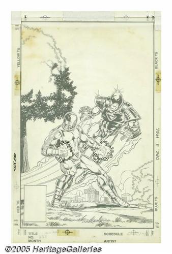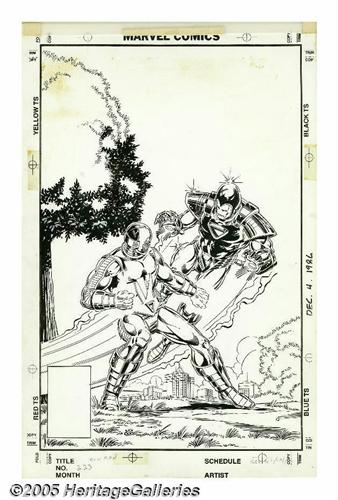 <B>Mark Bright and Bob Layton - Unpublished Iron Man #223 Cover Original Art (Marvel, 1987).</B></I> Iron Man battles the foe named Force in the open fields around Stark Industries. This cover is a highly detailed alternate version to the one used for <B>Iron Man</B></I> #223. Part of the image was inked on a separate vellum overlay. The image area of the cover is 10" x 15" and the art is in Excellent condition. Part of the image was inked on a separate vellum overlay.