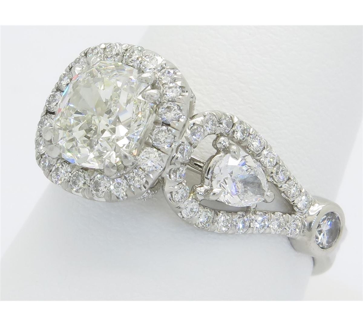 One tested platinum designer Mark Broumand diamond ring. Containing: 1 EGL Certified Cushion Cut Diamond, Size: 1.75CT, Clarity: VVS1, Color: F. 88 Round Brilliant Cut Diamonds, 2 Pear Cut Diamonds. Approximate total diamond weight: 2.89CTW. All diamonds are graded in the mounting unless otherwise stated. Weight of ring: 8.6 grams, Size: 7.5.